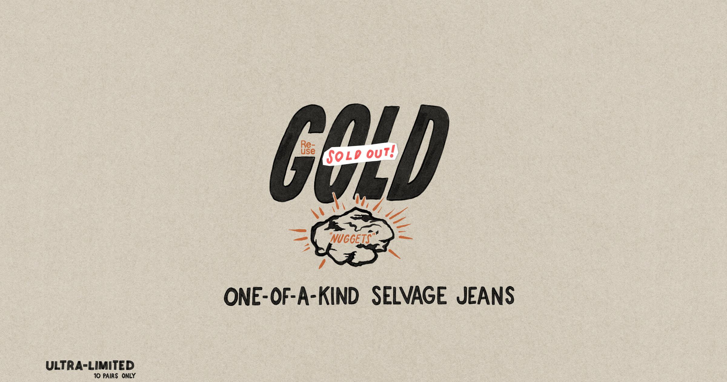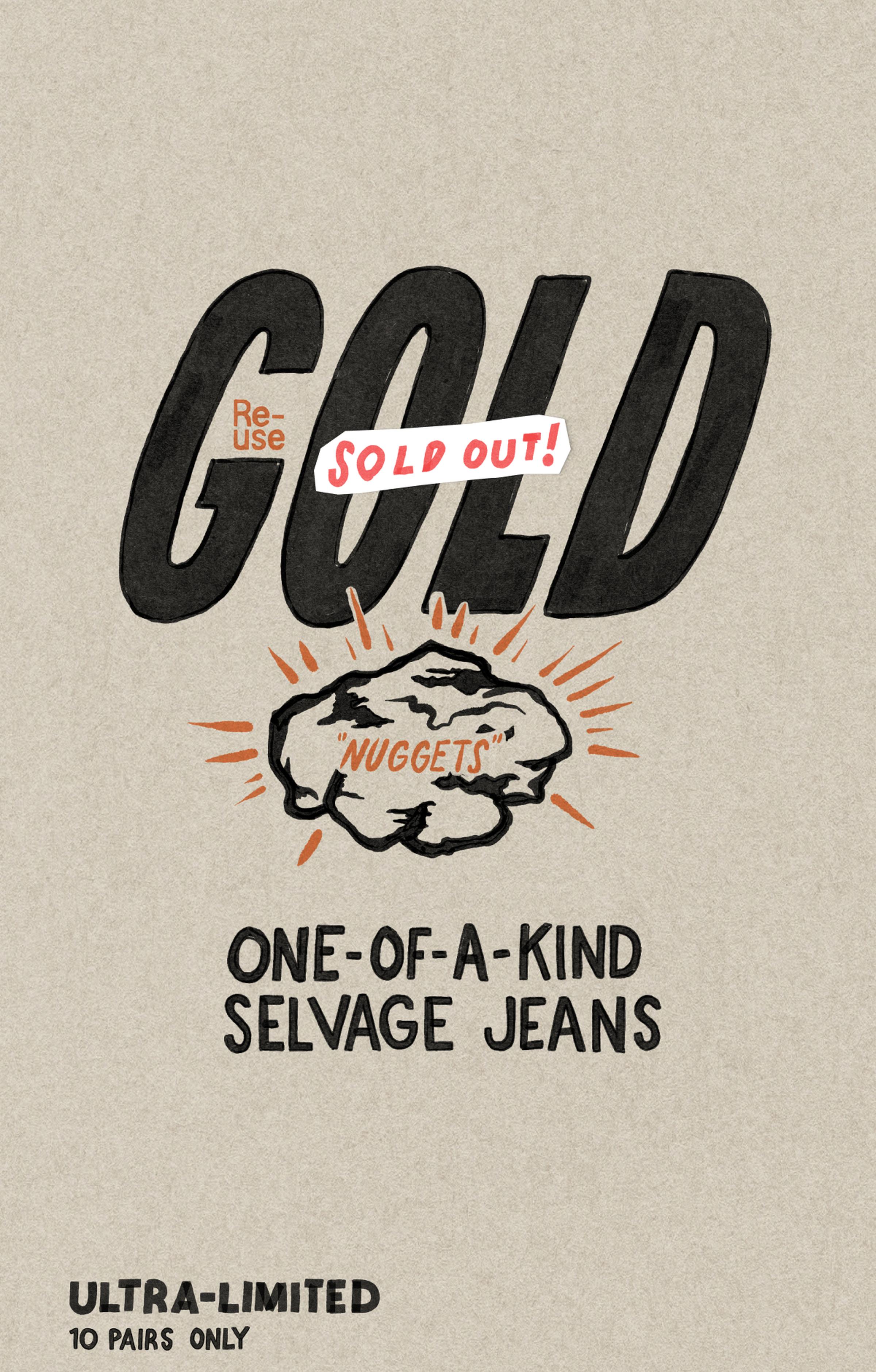 All gold sold. But…Re-use is always available at our Nudie Jeans Repair Shops and Repair Partners. Selvage options included.