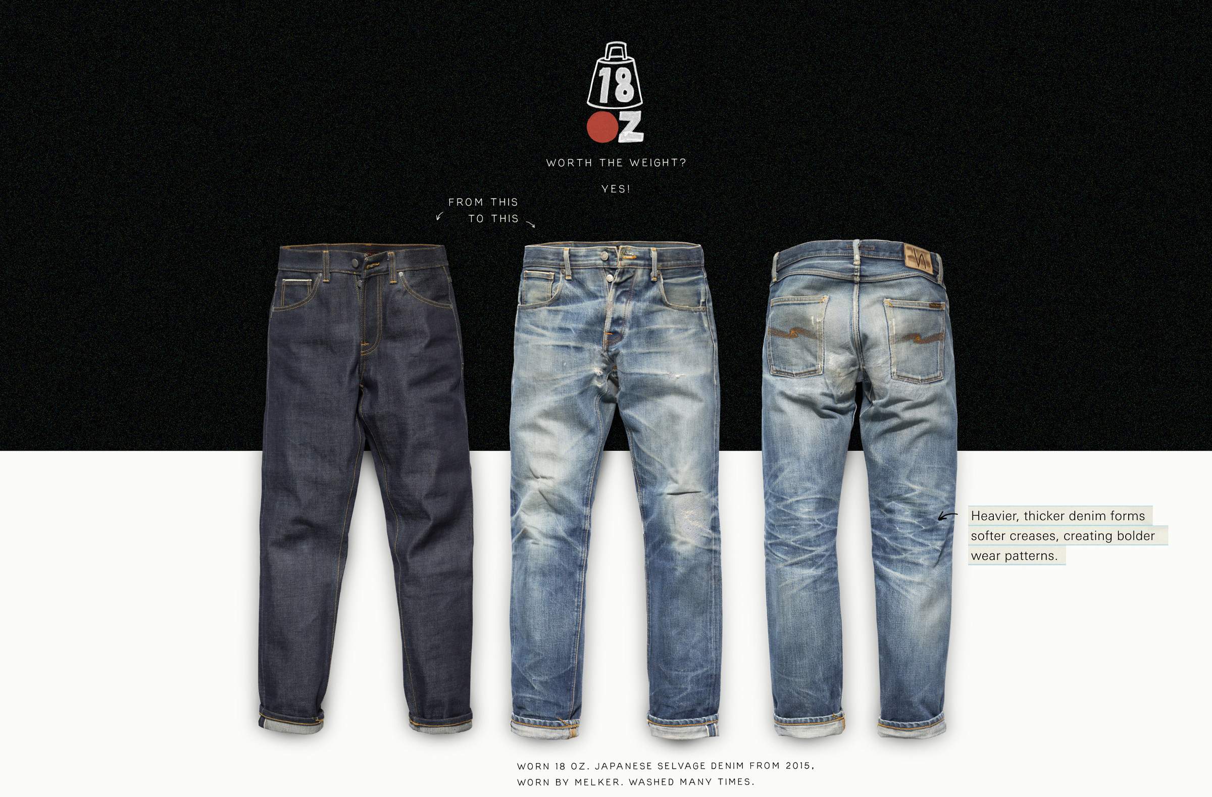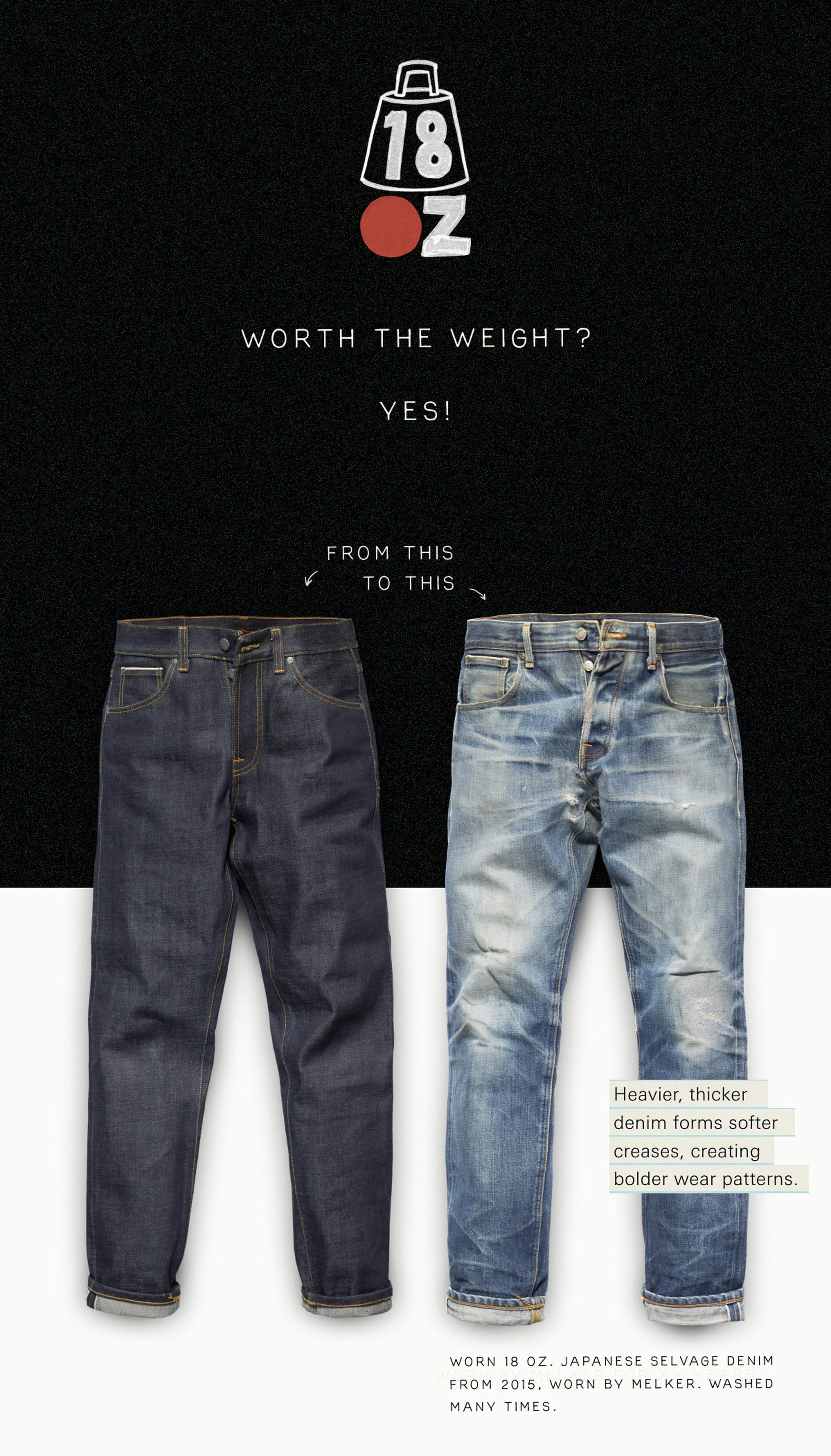What draws us to heavy denim are two main qualities. First, the way it feels—its substantial rigidity and texture, both when you hold it and when you wear it. Second, the way it breaks in. Heavier, thicker denim forms softer creases, creating bolder wear patterns. The thicker yarns amplify the texture, highlighting the twill weave and the yarn’s irregularities as it ages and evolves.   So, while you might end up with jeans that are more durable, what we truly value are the tactile and aesthetic qualities that set heavyweight denim apart. Its rigidity and unique break-in process offer something distinct compared to mid-weight denim.